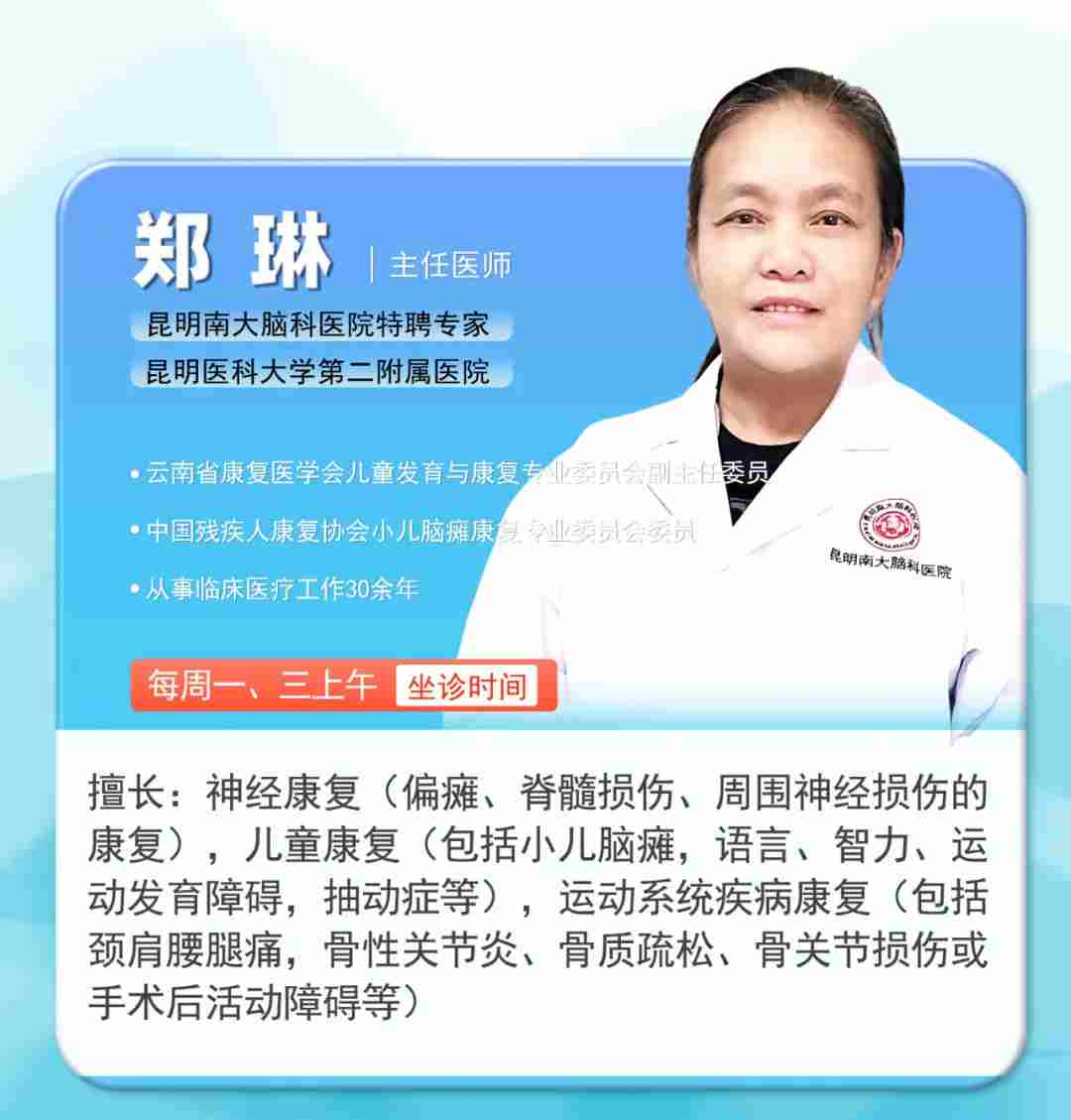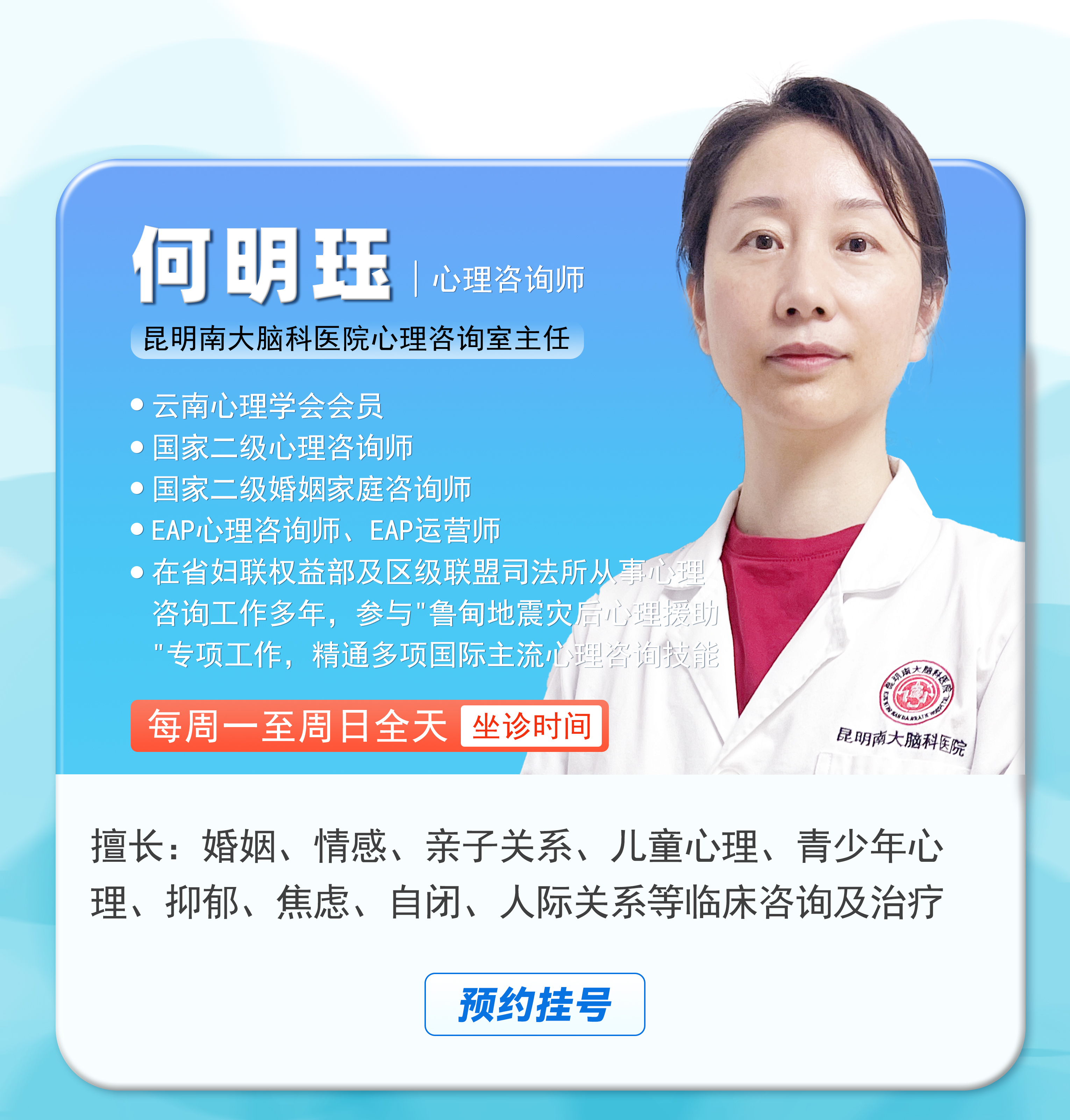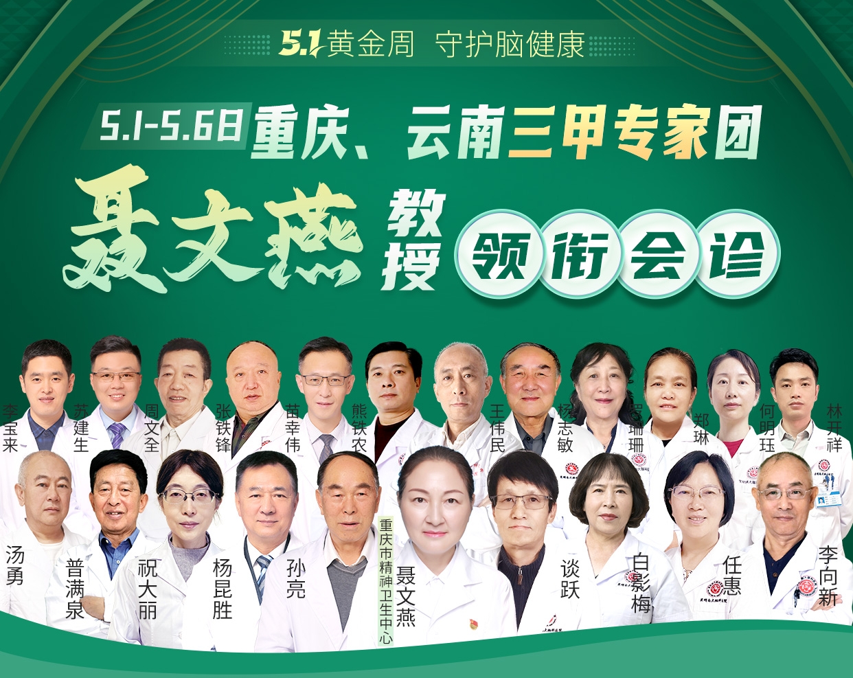 值此五一假期来临之际,昆明南大脑科医院将于5月1日-5月6日全面开启“无假日专家诊疗”模式,并特邀重庆市精神卫生中心聂文燕教授莅昆,携手云南三甲医院省级脑科专家,组建高水平公益会诊团,为西南地区百姓提供从精准筛查、规范诊疗到长期康复的全周期脑健康管理服务,让广大患者无需远行,就能在家门口享受“多对一”的高端精准诊疗服务,用专业守护大脑健康,让五一假期更有“医”靠!