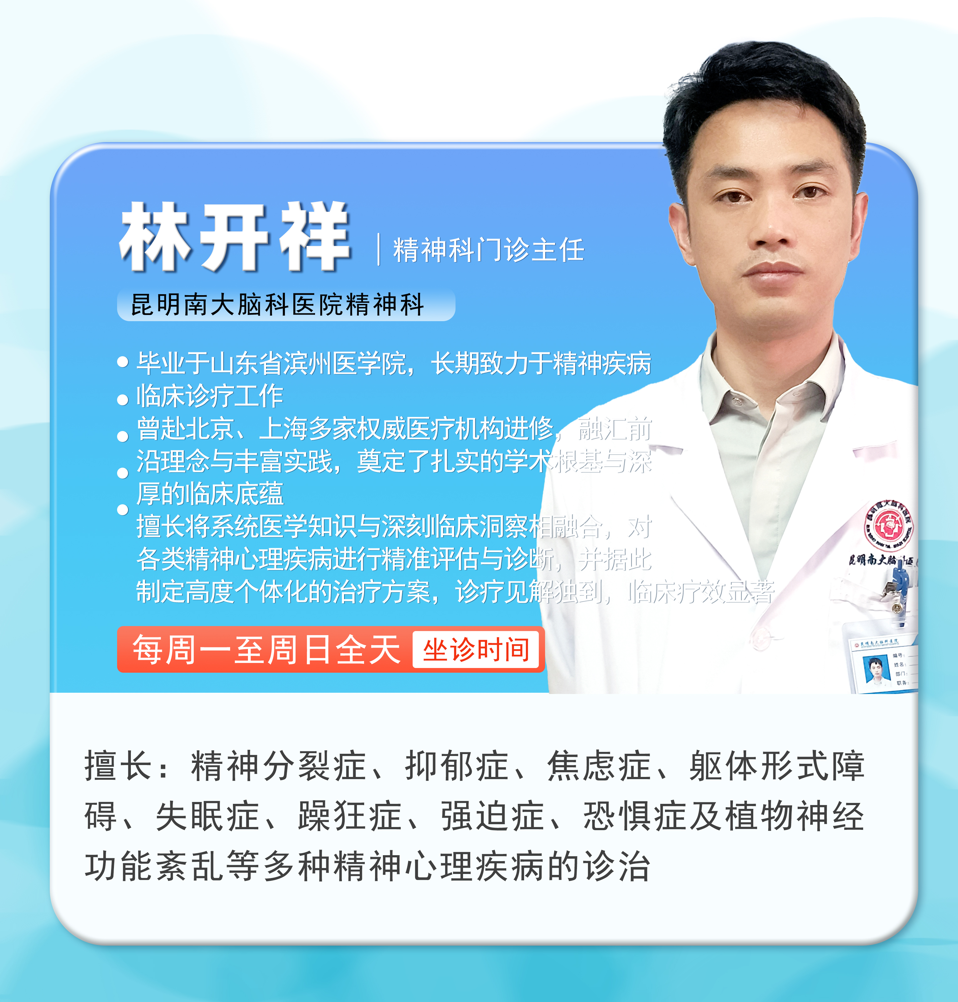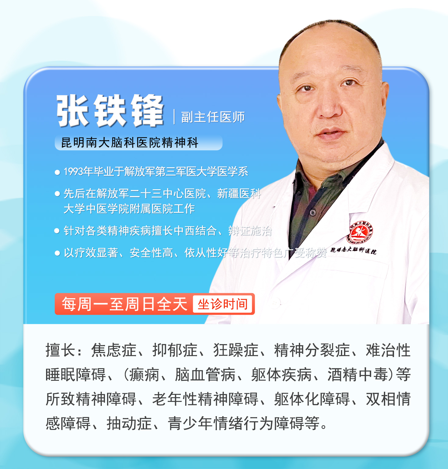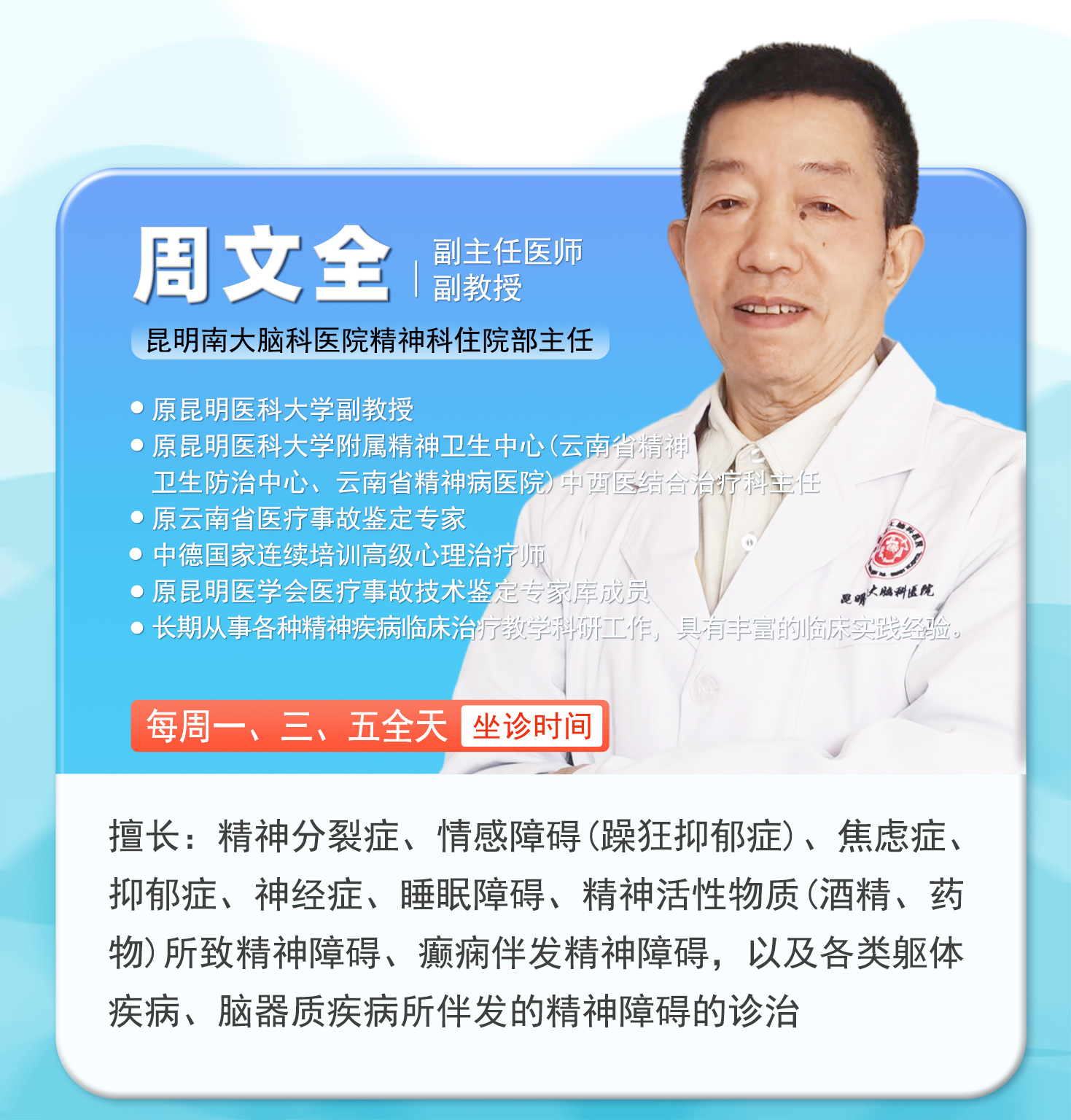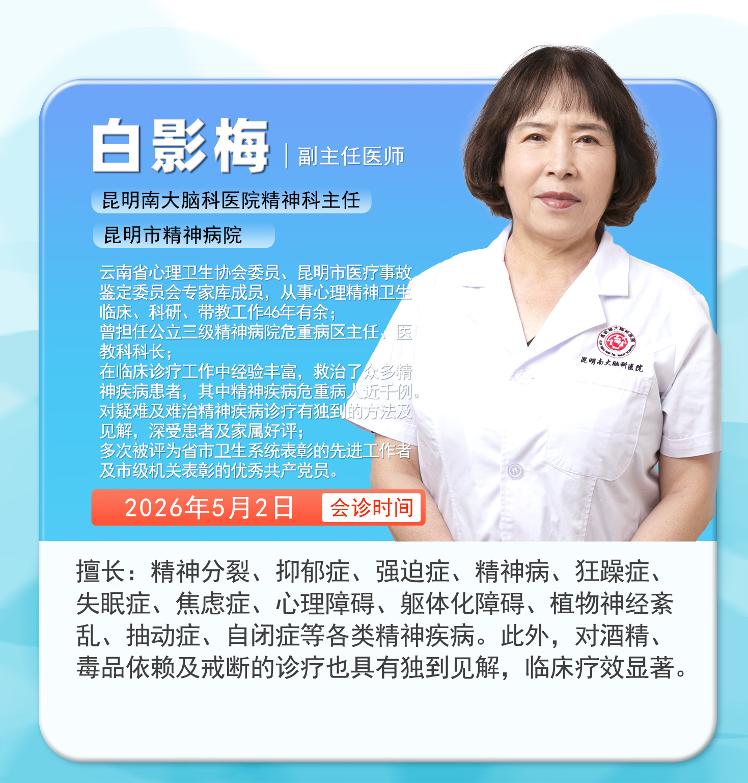 值此五一假期来临之际,昆明南大脑科医院将于5月1日-5月6日全面开启“无假日专家诊疗”模式,并特邀重庆市精神卫生中心聂文燕教授莅昆,携手云南三甲医院省级脑科专家,组建高水平公益会诊团,为西南地区百姓提供从精准筛查、规范诊疗到长期康复的全周期脑健康管理服务,让广大患者无需远行,就能在家门口享受“多对一”的高端精准诊疗服务,用专业守护大脑健康,让五一假期更有“医”靠!