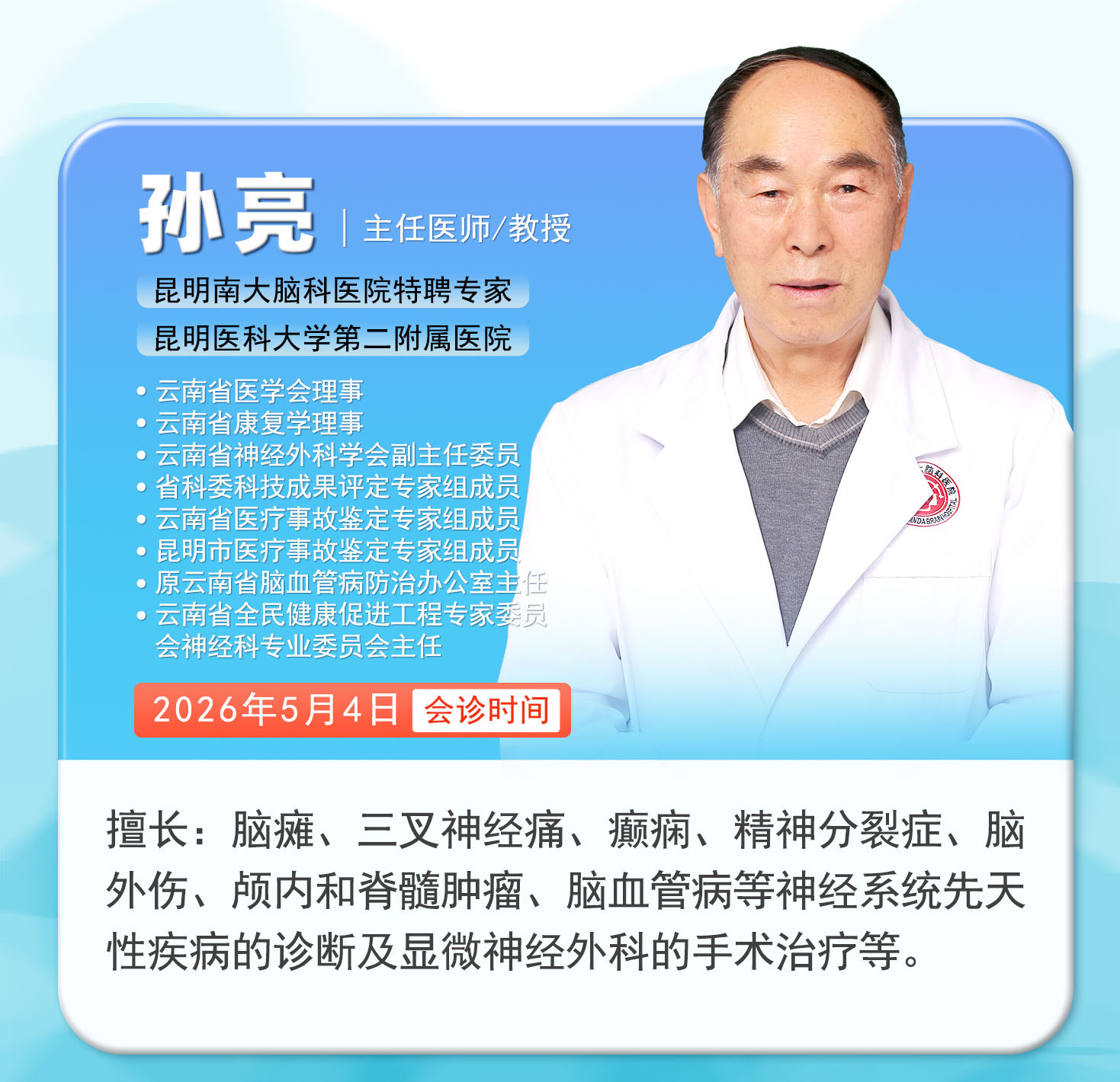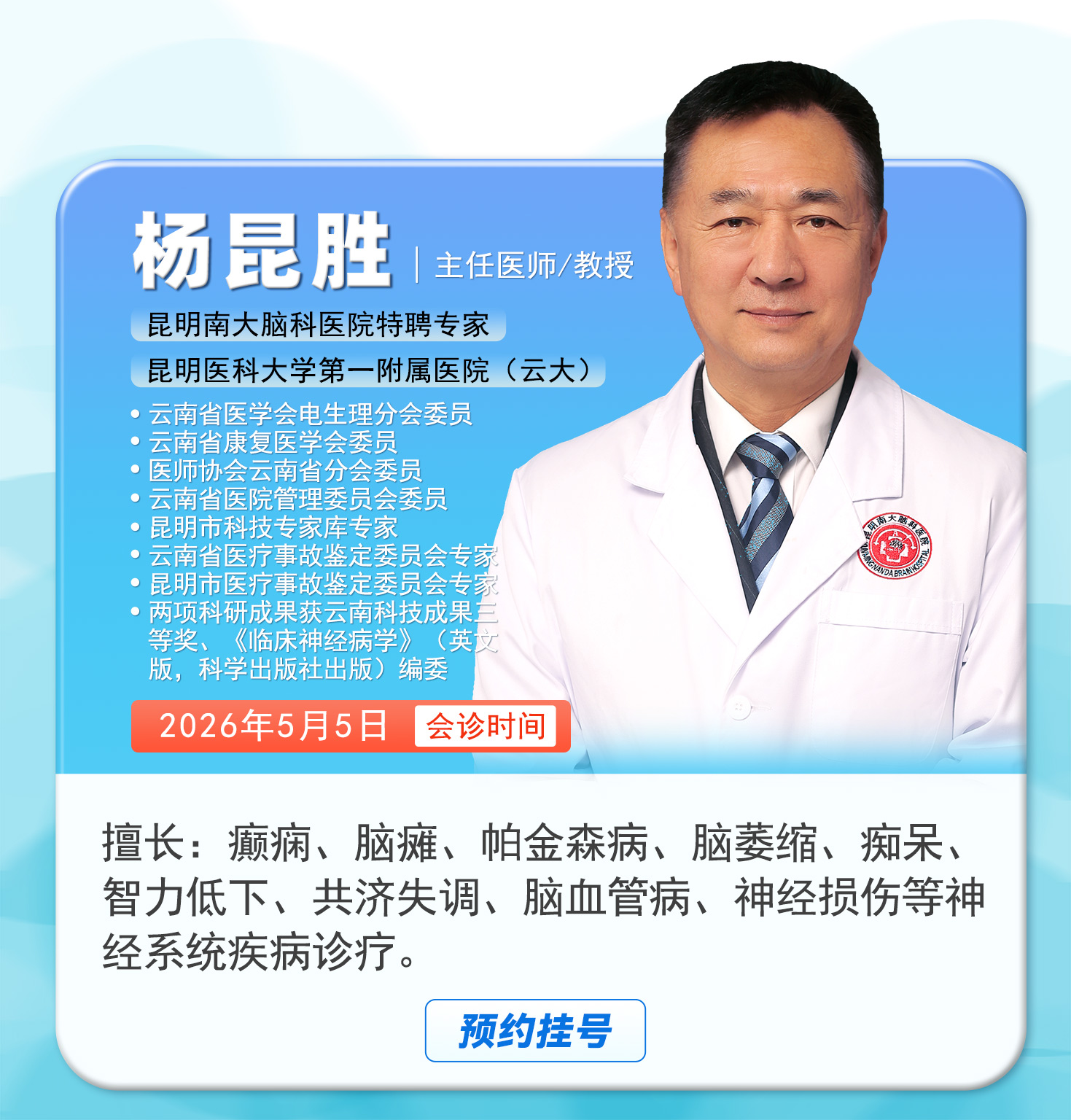 温馨提示:为保障会诊质量,让每位患者都能获得充分的诊疗时间,本次五一脑科联合会诊实行限额预约制,每位专家仅限10个会诊名额,先约先得,约满即止!